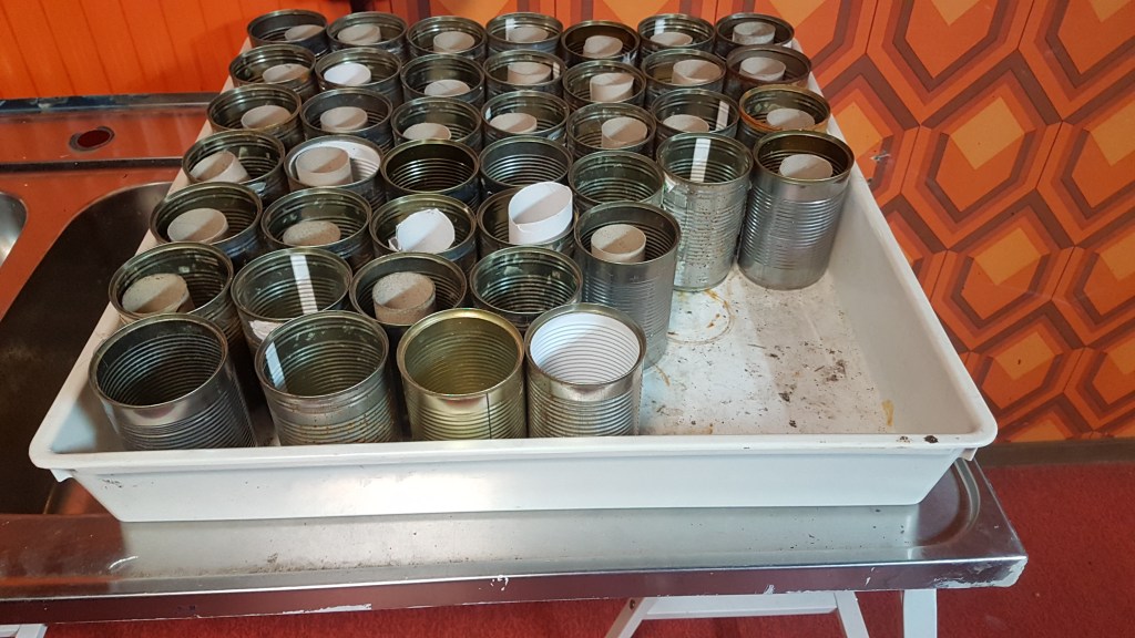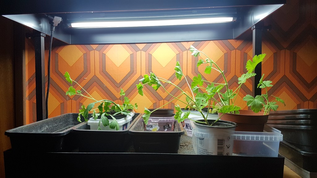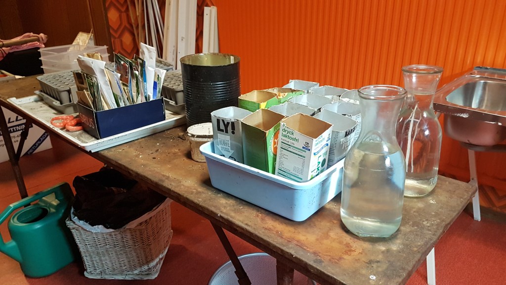 I år har jag gott om utrymme i ”Hobbyrummet” i Nya Villa Linnea att tillgå. Hyllor, odlingslåda med belysning, arbetsbänk och diskbänk är hitflyttade från Evatorp. Plus alla toapappersrullar, mjölk- och juicekartonger jag har sparat under året.