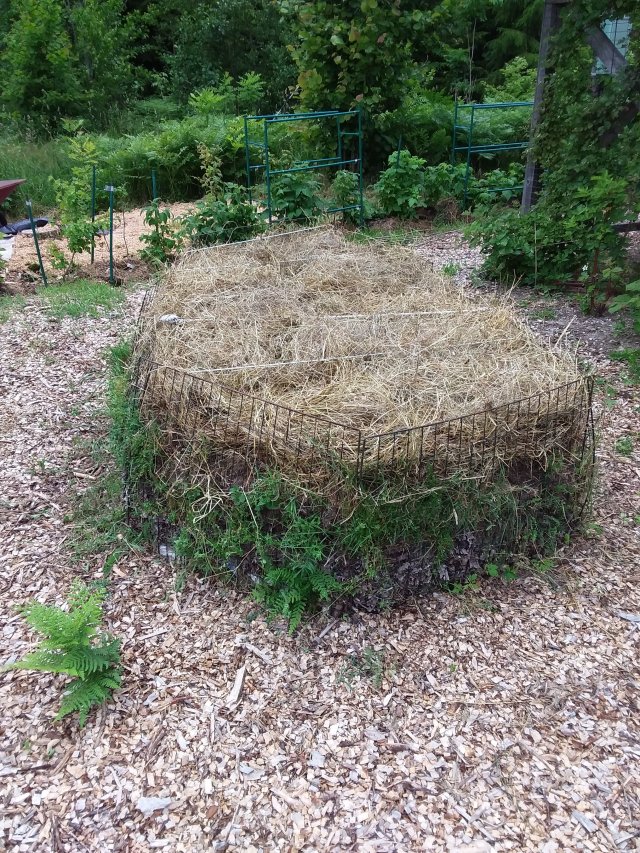 Täcket togs bort och återanvändes till förberedelsen till nästa års utökning av ”Frukt&Bär”. Odlingsbädden hade sjunkit rejält sen förra året, speciellt på ena sidan, så den behövde jämnas ut. I den vita lådan ligger den potatis som ska planteras och i de svarta säckarna ligger torrt, kasserat ensilage som ska toppa hela härligheten