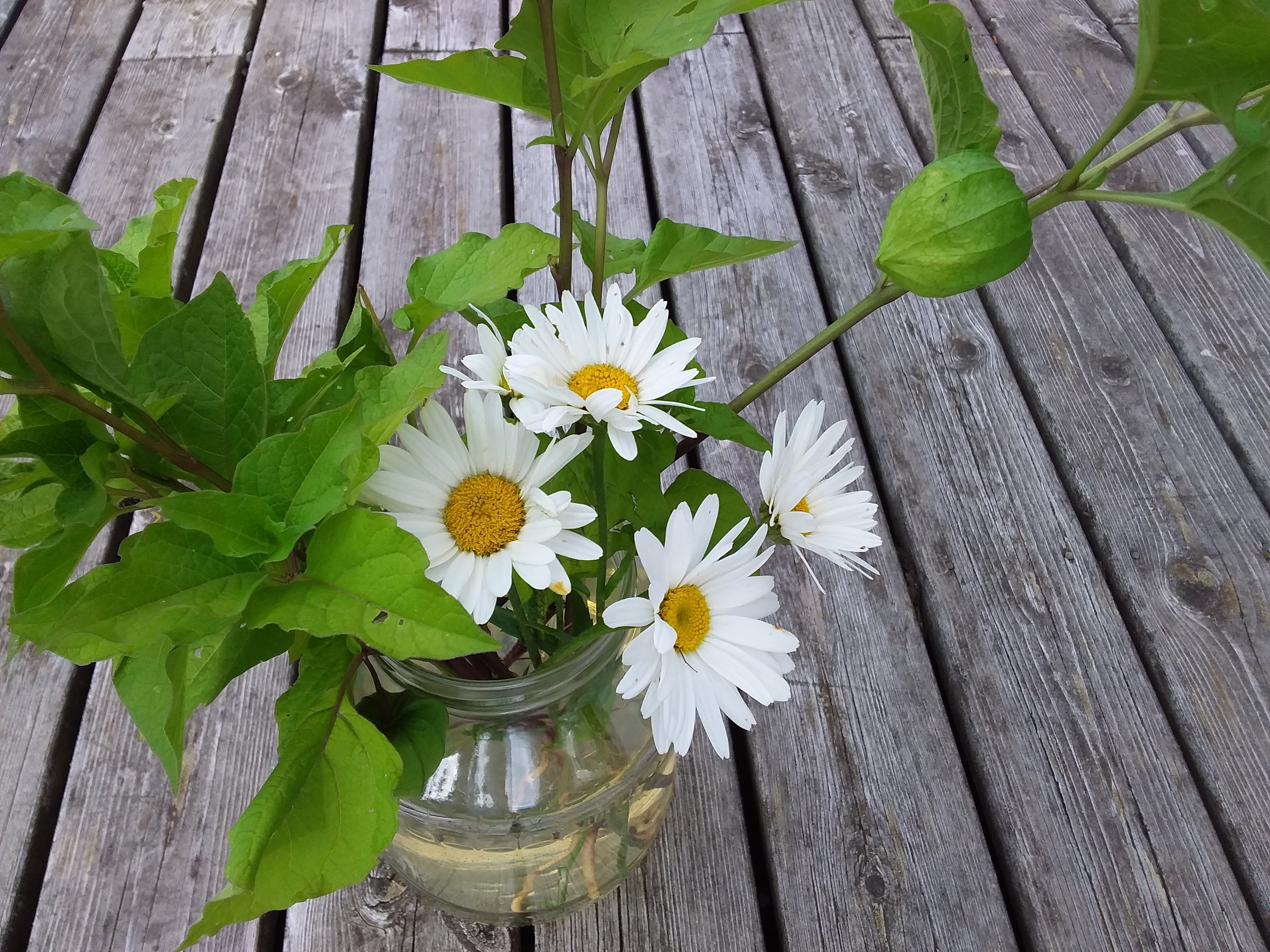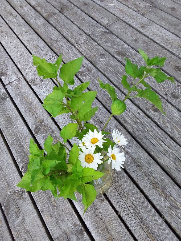 Den här veckans fredagsbukett blir (nog) de sista Prästkragarna för i år. I buketten finns också Japansk lykta (som ska transplanteras till Villa Linnea och den Eldiga Rabatten). De läckra lyktorna blir orange framemot hösten, så de passar jättefint i den Eldiga rabatten.