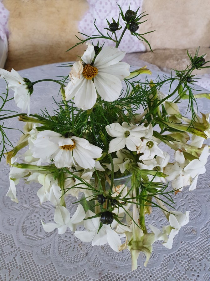 Fredagsbuketten – det vita som finns kvar i rabatten (Rosenskära och Blomstertobak)