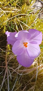 Det är ett riktigt aprilväder med frost på nätterna och strålande sol på dagarna. Än så länge är det kala äppelträd, men på marken finns det både krokus och blåsippor.